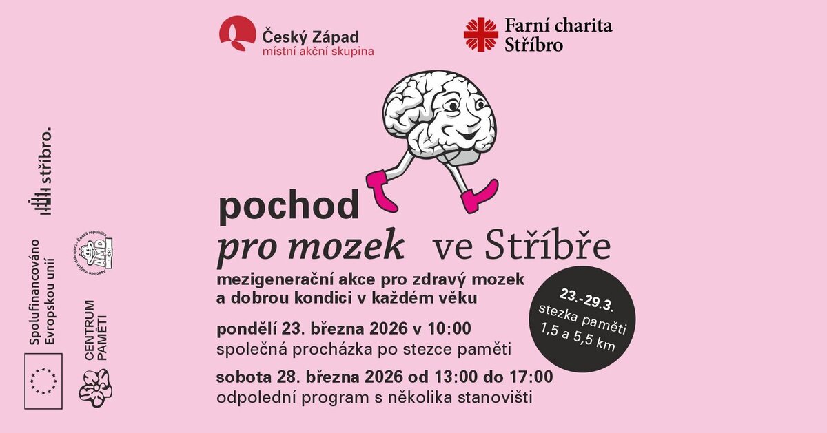 V sobotu 28. března 2026 od 13.00 do 17.00 hodin se ve Stříbře uskuteční akce s názvem Pochod pro mozek, která je zaměřená na podporu zdraví mozku a dobré kondice v každém věku. Návštěvníci se mohou těšit na pestrý program pro lidi v každém věku.